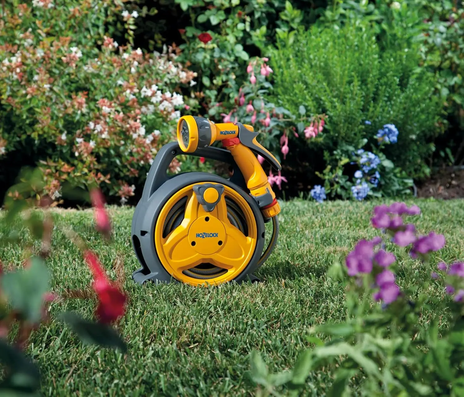 بكرة مزودة بخرطوم تسهّل تخزينه واستخدامه في الري.
